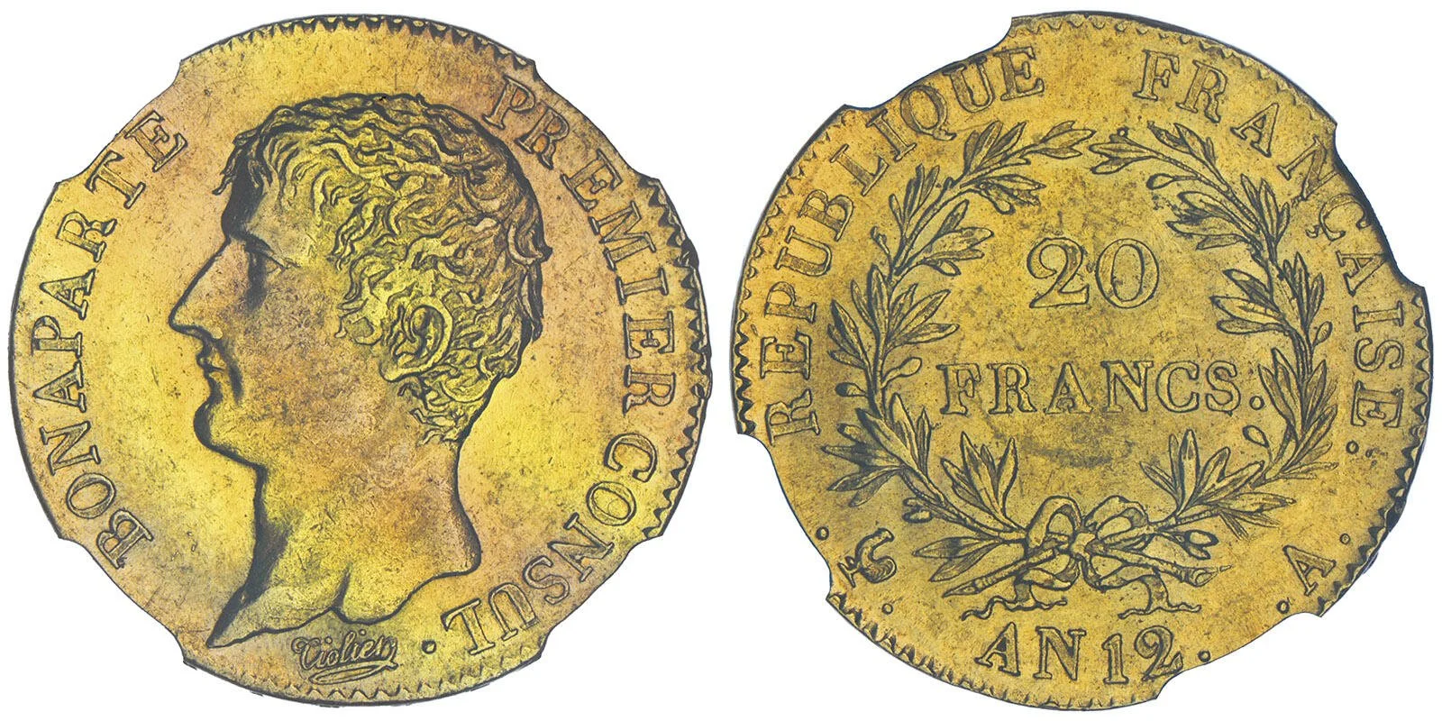 Napoleon I’s first coin (AN XI) had a limited mintage of 58,262 and is by far the lowest mintage year of any of his 20 francs coin types. The coins were minted between April 1803 (declaration of the standard) and September 1803 (end of AN XI).