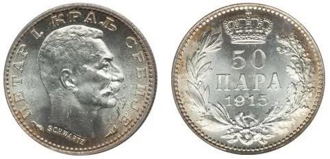 The Serbian currency, the Dinar (100 para = 1 dinar) was first minted in silver in 1875 and in gold in 1882. Coins were minted under Milan I and Peter I, but not under Alexander I.